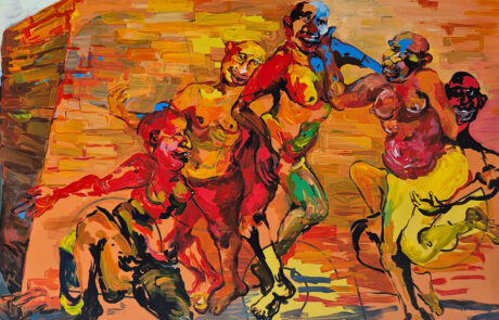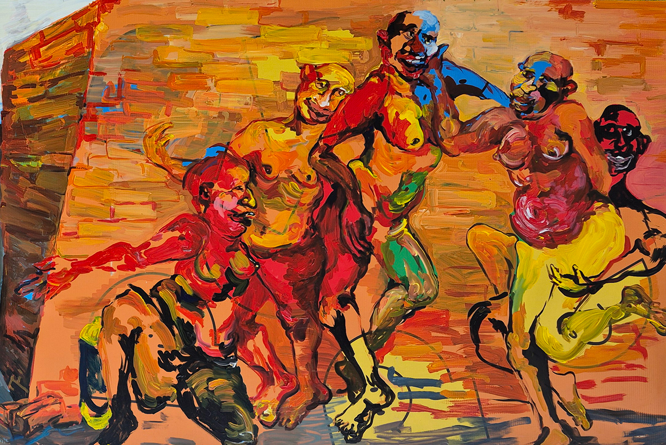 Busco accionar colectivamente cómo se ve la dulzura aquí y ahora en Lima, porque considero que cuando dejamos de seguir las normas sociales, aparece un trato atento y se da la confraternidad. Junto a mujeres y diversidades, realizo performances donde jugamos fuera de lo esperado en espacios públicos para que, tanto quienes participamos como quienes nos ven en la calle o en video, podamos sonreír por al menos un momento ante una ciudad injusta y violenta. Ese sentimiento lo llevo a mi pintura, donde retrato personas sin accesorios, sin vergüenza y con ganas de contacto.